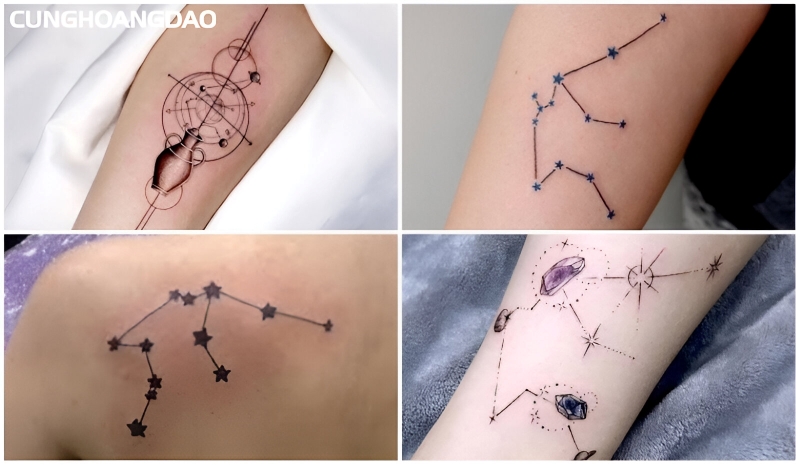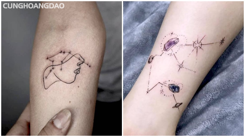 Hình xăm chòm sao là một thiết kế tinh xảo với các ngôi sao được nối với nhau bằng những đường mảnh, tái hiện chòm sao Bảo Bình trên bầu trời đêm. Đây là cách thể hiện bản sắc chiêm tinh một cách bí ẩn và nghệ thuật.