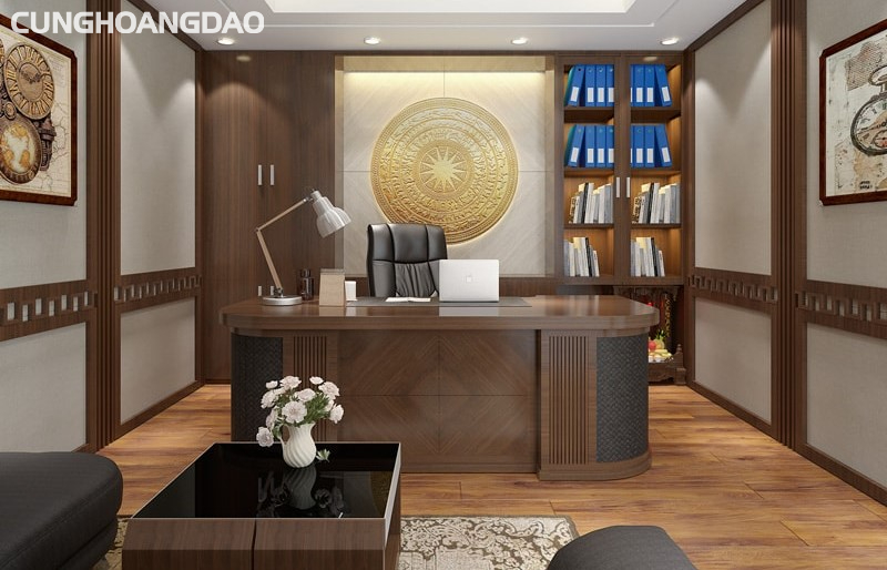 - Hệ thống lưu trữ hiệu quả: Tủ tài liệu, kệ sách và các hộc kéo được tổ chức rõ ràng giúp duy trì trật tự và giảm thiểu sự xao nhãng.