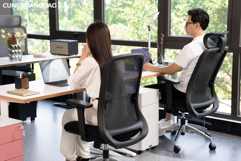 - Ghế công thái học: Với khả năng điều chỉnh linh hoạt và hỗ trợ tốt cho phần thắt lưng, giúp giảm đau mỏi và tăng năng suất khi làm việc lâu.